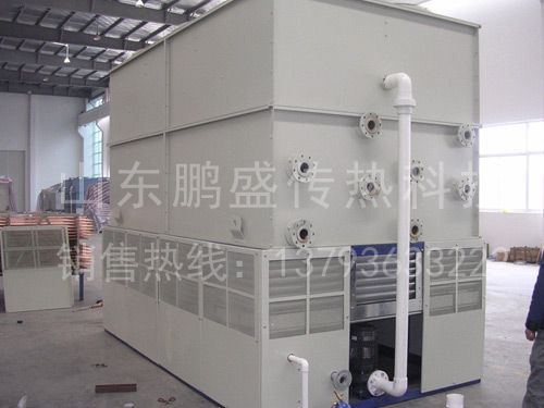 1、闭式冷却塔实际上是一种蒸发式冷却塔,冷却器和湿式冷却塔的组合,它是卧式的蒸发式冷却塔,工艺流体在管内流过,空气 在管外流过,两者互不接触。闭式冷却塔是传统冷却塔的一种变形和发展。塔底蓄水池内的水由循环泵抽取后,送往管外均匀地喷淋下来。与工艺式流体热水或制冷剂和管外空气并不接触,成为一种闭式冷却塔,通过喷淋水增强传热传质的效果。